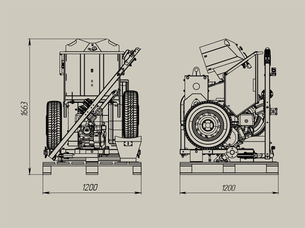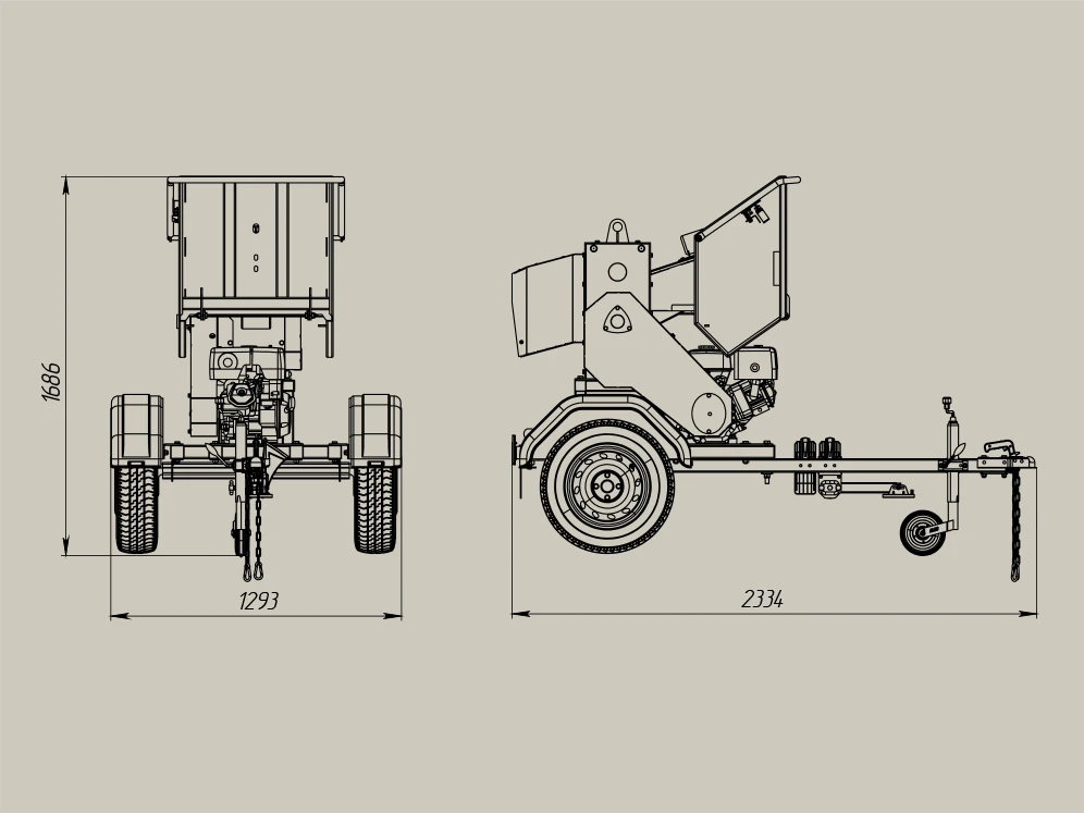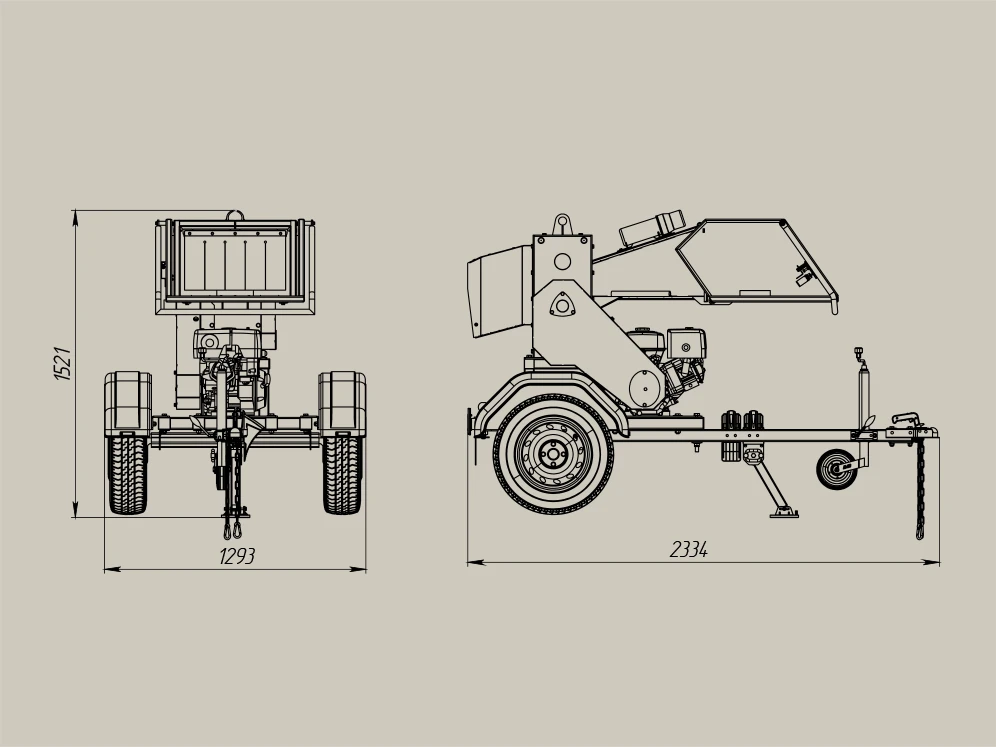 • Подрібнювач встановлено на професійну вісь з автомобільними колесами. Можна з’єднати в одну зцепку: автомобіль – подрібнювач – причіп.